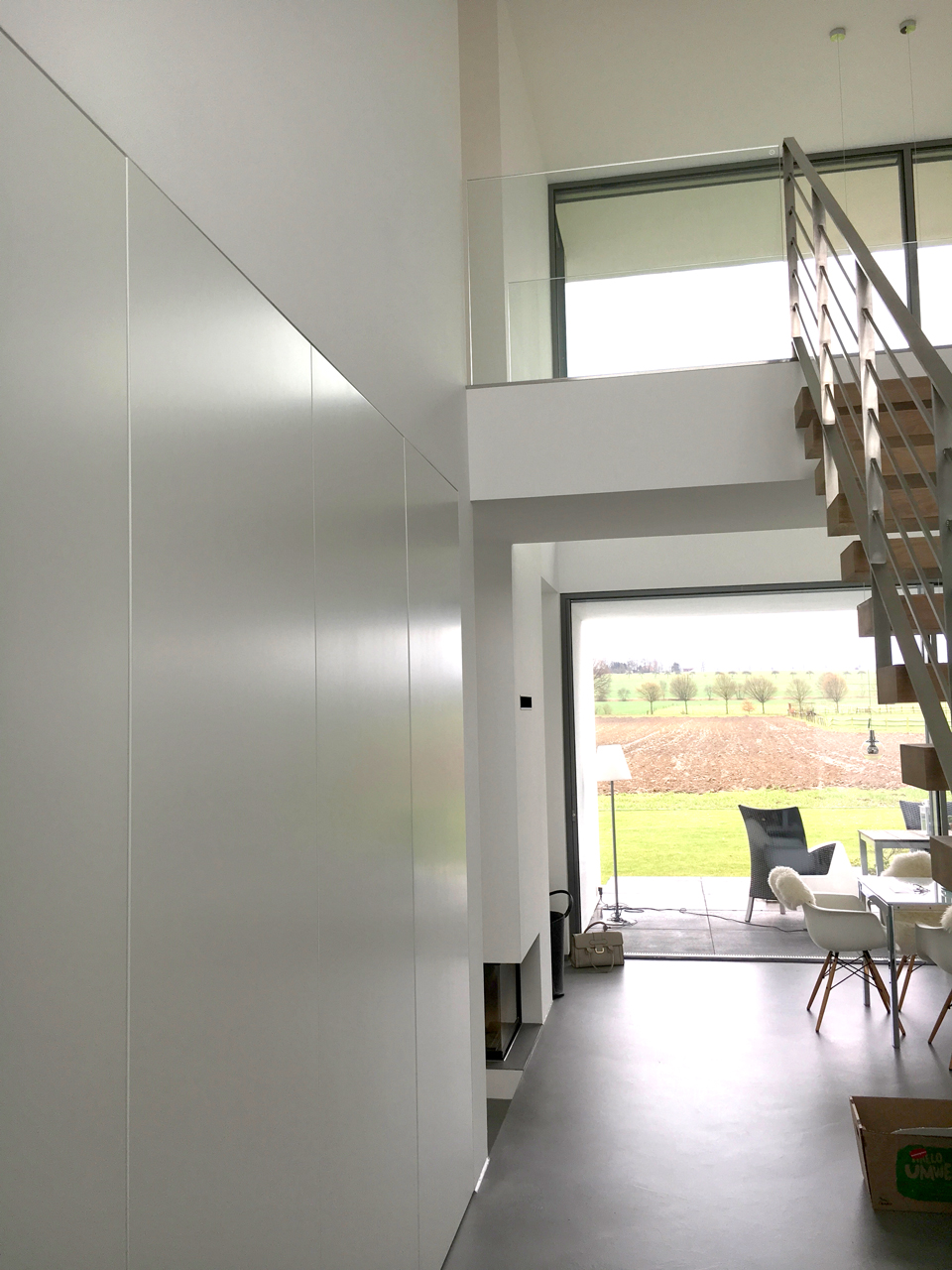 In ruhiger Dorfrandlage in unmittelbarer Nachbarschaft zu einem Naherholungsgebiet entsteht ein modernes Wohnhaus. Der architektonische Entwurf zeichnet sich durch eine klare, geometrische Formsprache aus: Erd- und Obergeschoss des Gebäudes bestehen aus zwei verschachtelten Kuben, die sich zum öffentlichen Raum hin nahezu verschliessen, während sie sich zur Südseite durch raumhohe, vollverglaste Schiebetürelemente öffnen. Das Raumkonzept führt diese puristische Gliederung fort, alle räumlichen Zuordnungen sind offensichtlich und schnell ablesbar, freie Sichtachsen führen die Blicke durch das ganze Haus hindurch in die weite Landschaft hinein. Die speziell unter ökologischen Gesichtspunkten geplante Gebäudetechnik mit Geothermie und Solaranlage soll die technischen Möglichkeiten regenerativer Energien effizient nutzen, um die Bewohner weitgehend autark hinsichtlich Ihres Energiebedarfs zu machen.